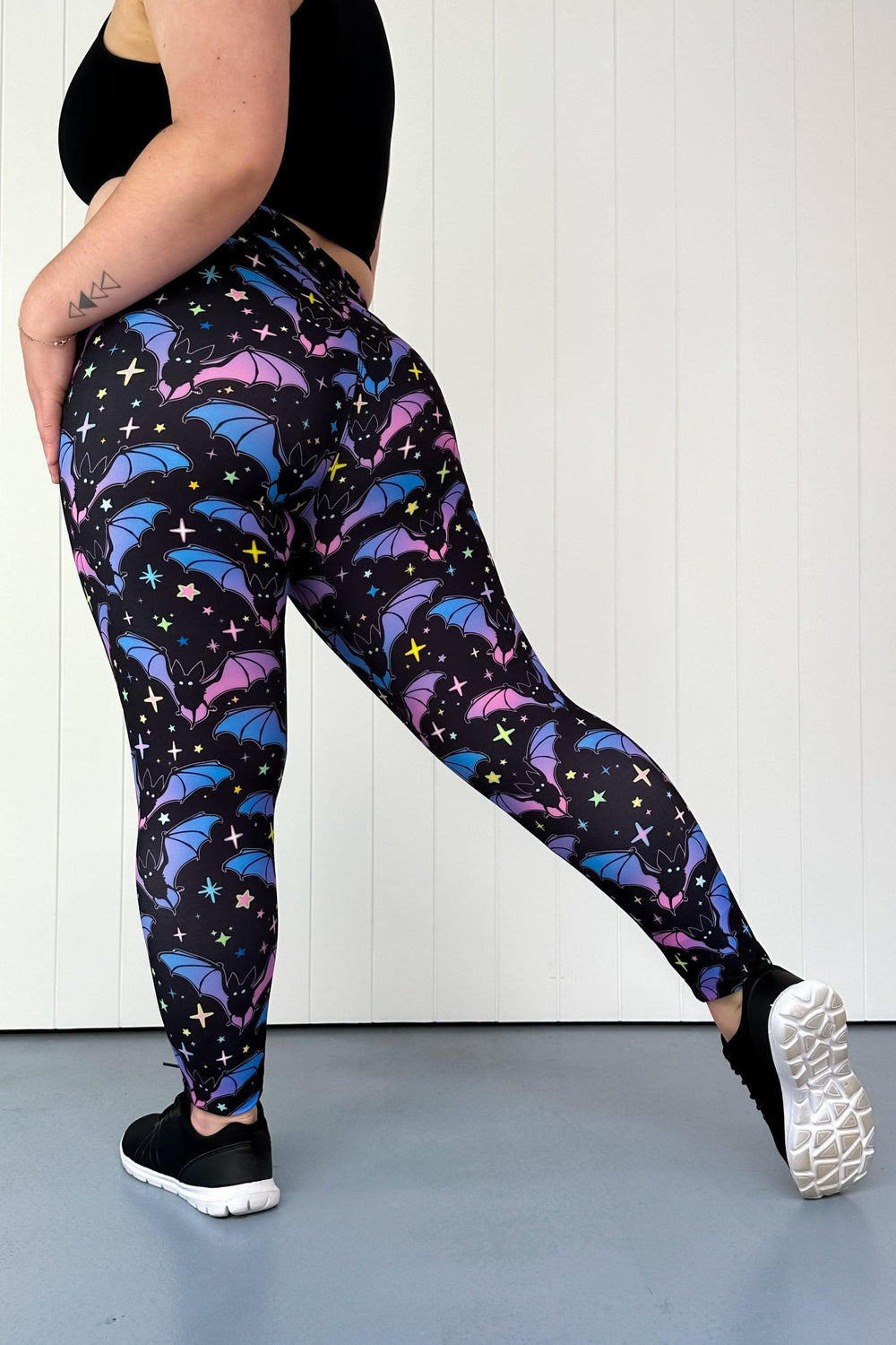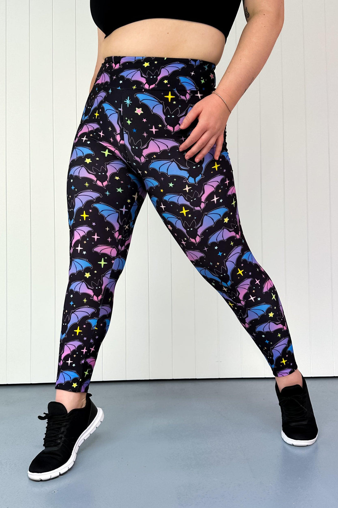 Person wearing black capri leggings with colourful sparkle-like star pattern, standing against a white wall.