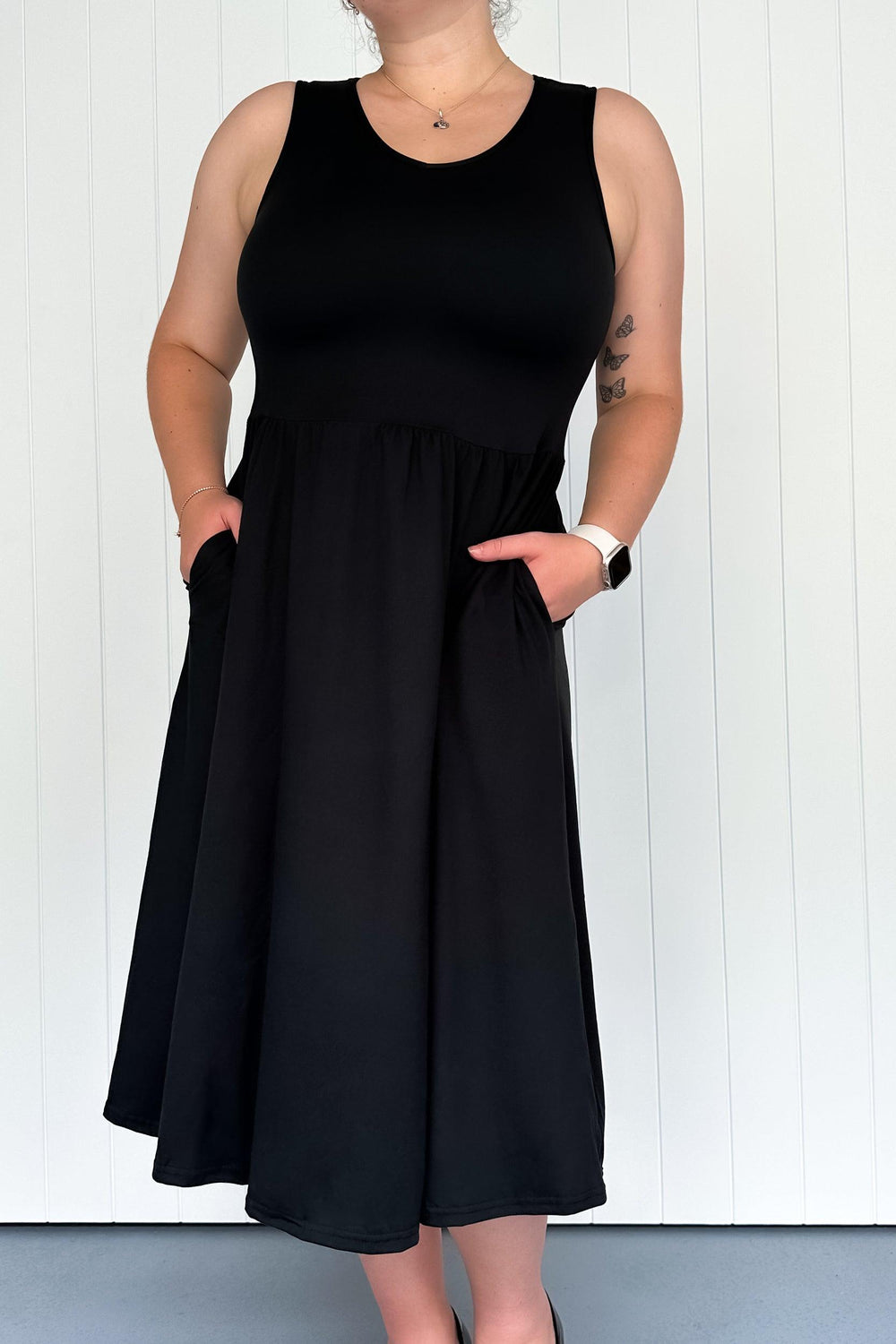 A model wearing a sleeveless black midi dress with pockets, standing against a white background.
