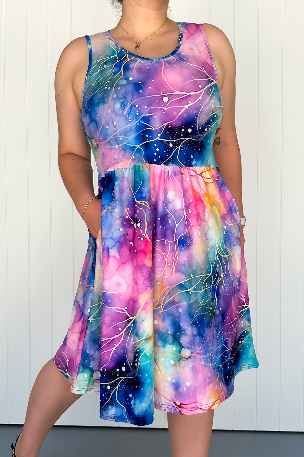 A sleeveless knee-length dress with side pockets featuring a vibrant multicolored tie-dye-like pattern.