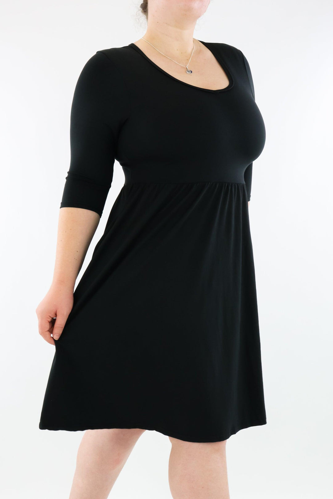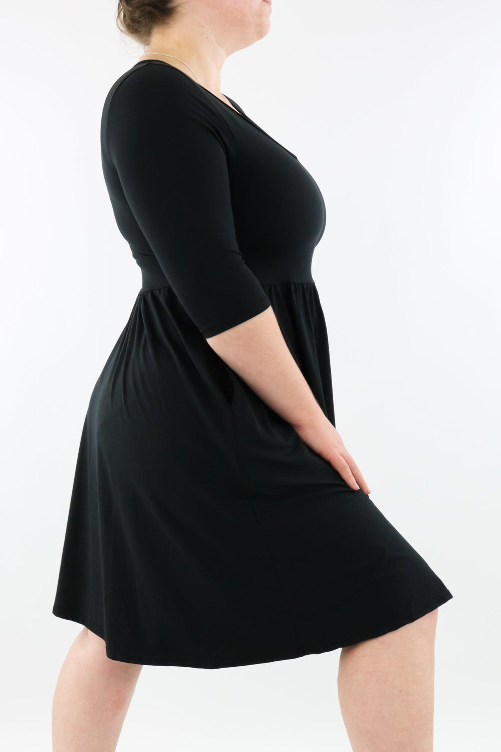 Black Skater Dress features 3/4 length fitted sleeves, invisible pockets, and a v neck-line in a knee length a-line style.