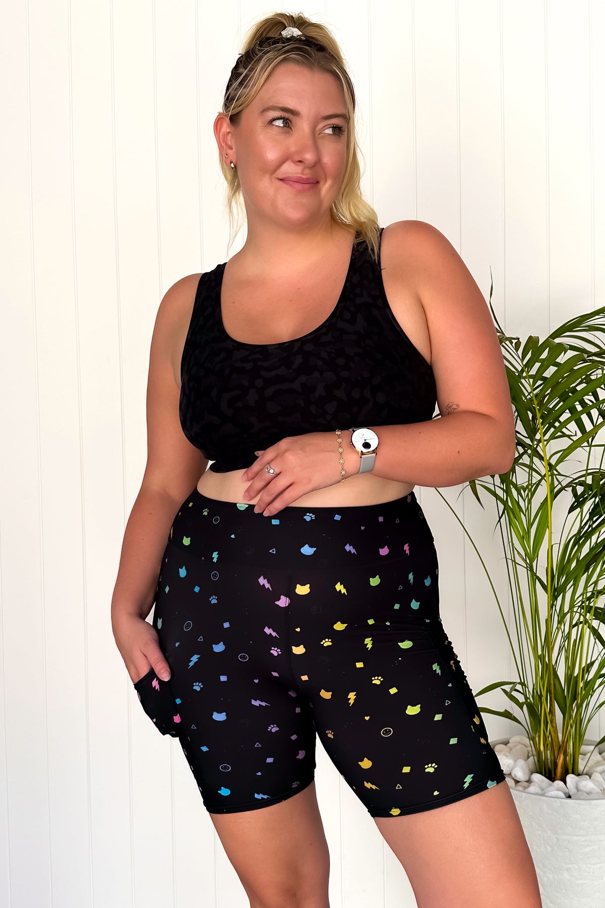 Love cats and fun printed shorts? Now you can have both! The Catfetti Casual Mid Shorts include the cutest neon cat faces, paw prints, and geometric shapes printed on a black background, creating an exciting cat-fetti explosion. These shorts are paws-itively perfect for proud cat parents or for those looking to add a little mischief to their wardrobe. And if you're someone that prefers a complete outfit, you can pair these shorts with our matching dress*.