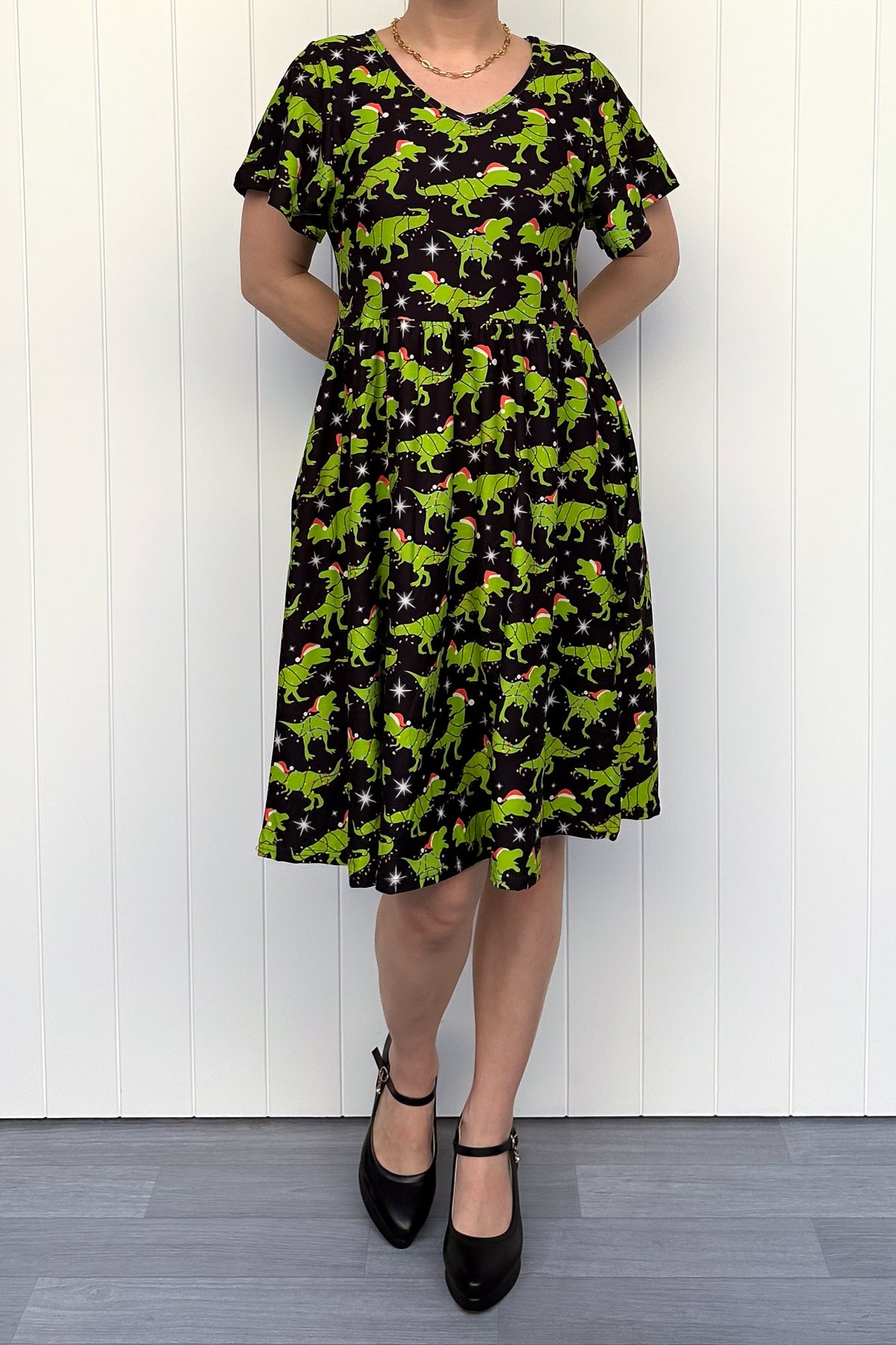 Christmas Dinosaur - Flutter Sleeve Dress - Knee Length - Pockets