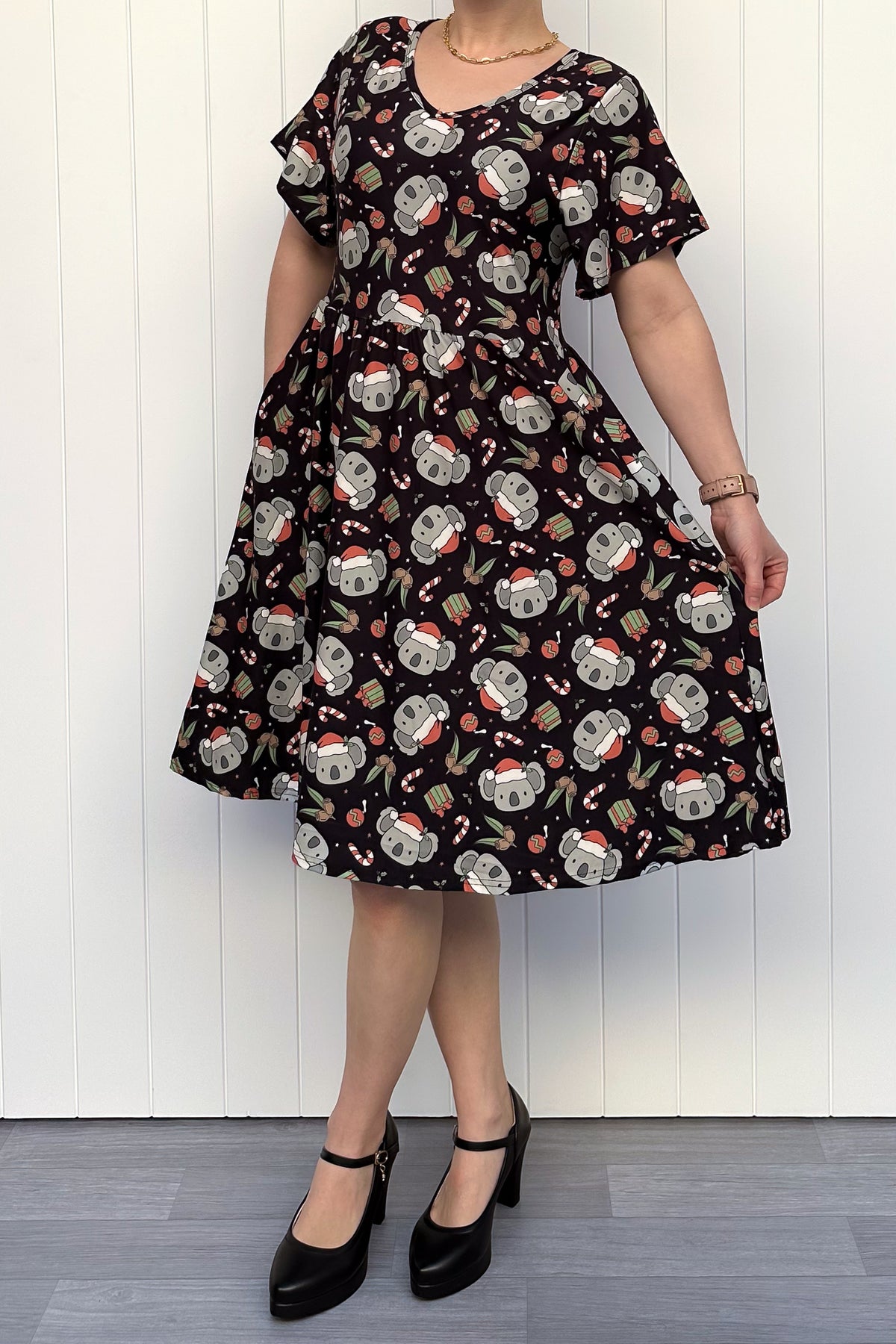 Person wearing a dress featuring a pattern of koalas wearing santa hats and candy canes on a black background, standing against a white wall.