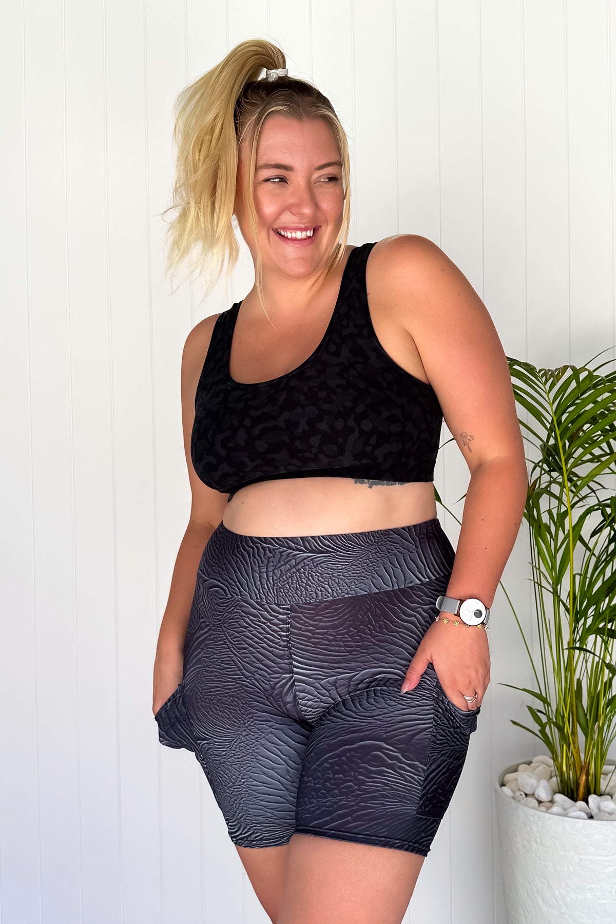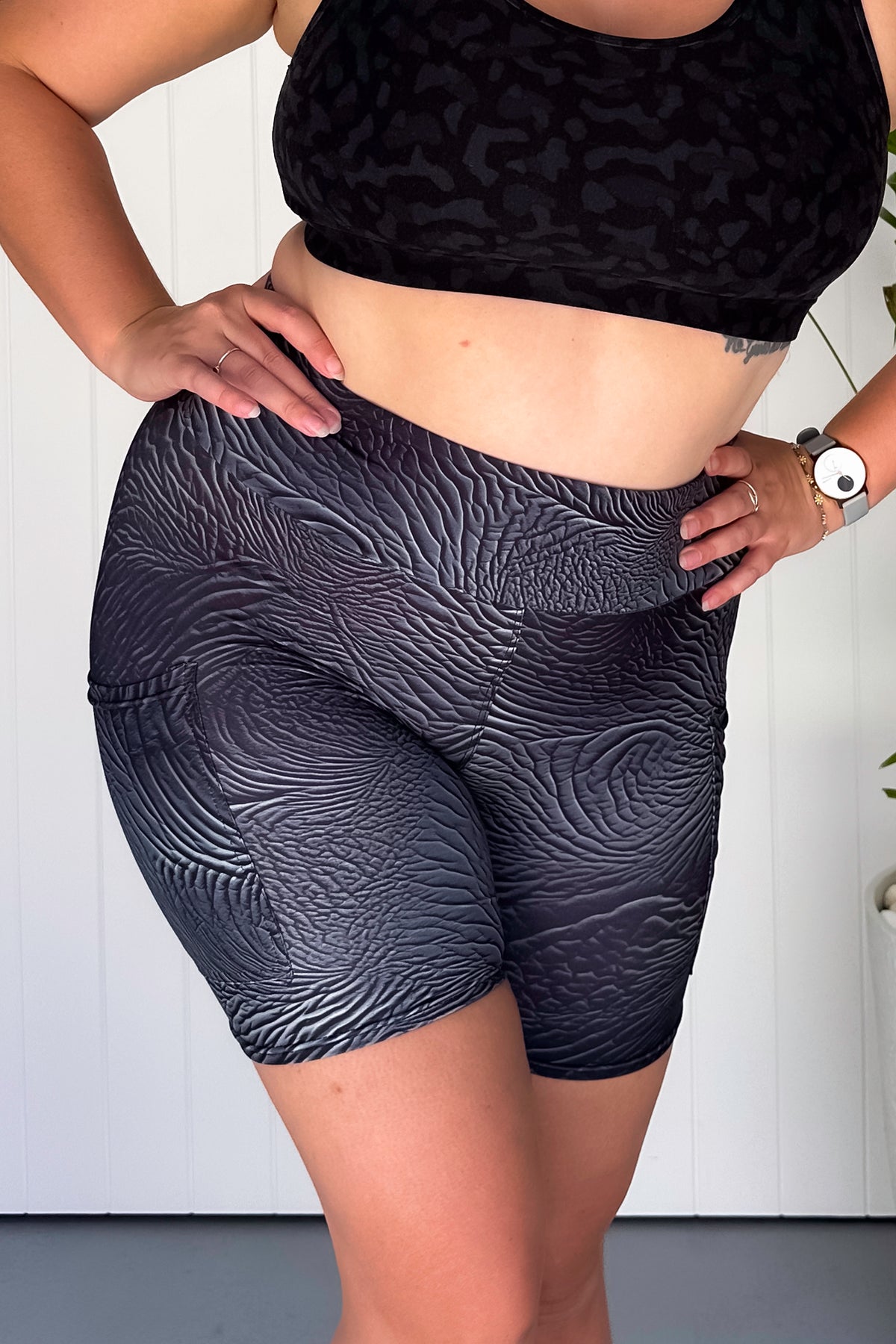 Leather Impression Mid-Length Shorts features a leather-like printed pattern in black, charcoal and grey. Made in a mid-length style, designed to sit mid-thigh, finished with two thigh patch pockets.