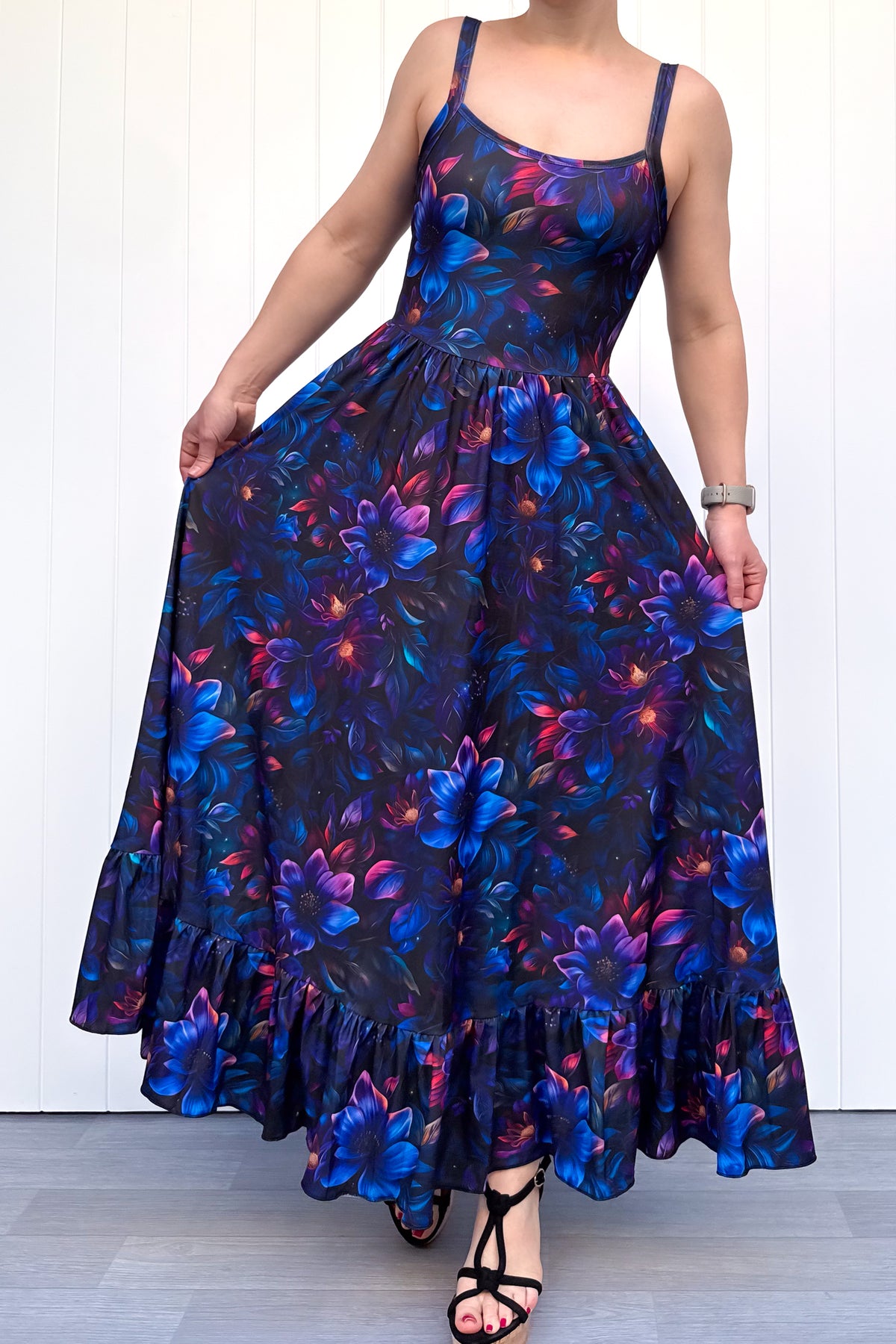 The Obsidian Petal Celeste Maxi Dress blooms in deep sapphire shadows and glowing violet petals, creating a dress that feels rich, magnetic and impossible to forget. It’s lush without being loud, dramatic without the tantrum and made for anyone who wants to walk through the world like a quiet storm.