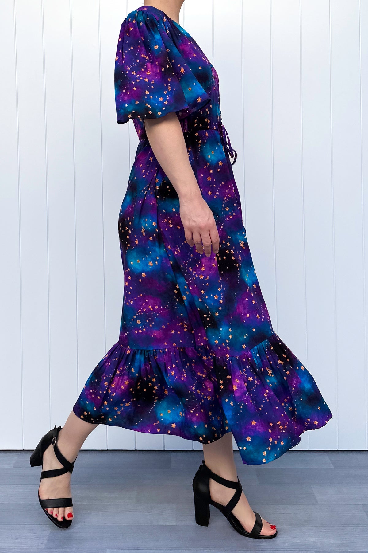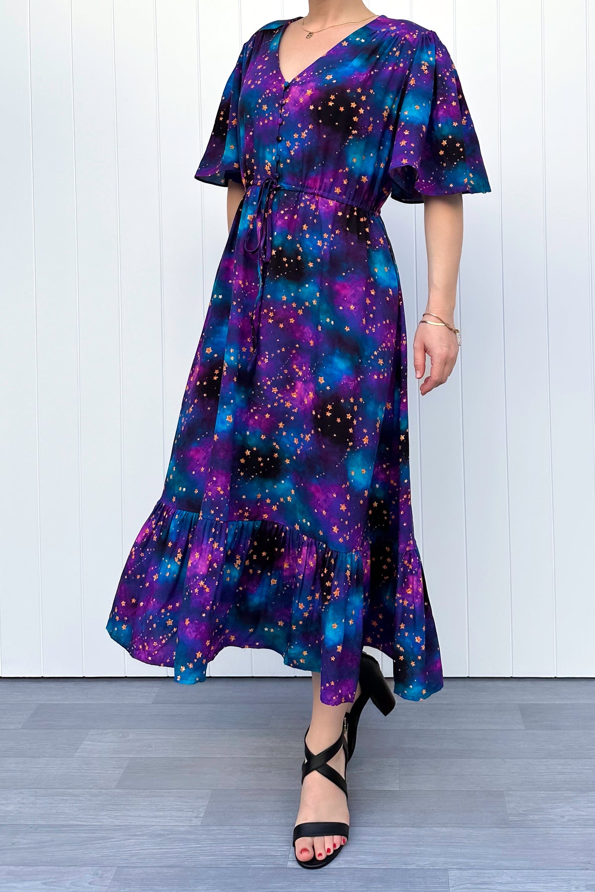 The Universe Shimmer Peony Midi Dress captures the magic of a starlit sky, blending deep purples, inky blues and scattered golden light into a dress that feels luminous and unforgettable. It’s playful, dreamy and designed for those moments when you want a little extra shimmer in your day. Crafted from soft touch rayon, it's lightweight, breezy and beautifully breathable. The adjustable waist tie lets you shape the fit to suit you, while fabric covered buttons are backed with a modesty panel for confident wear. Subtle puffed flutter sleeves and a ruffled tier hem add movement and romance, finished with pockets for everyday convenience.