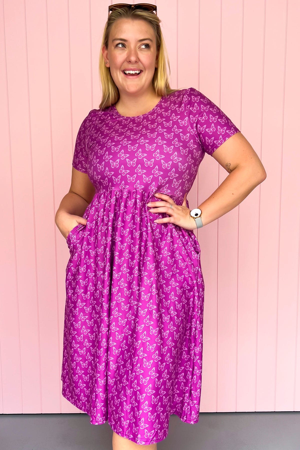 Rich Purple Butterflies - Midi Dress - Short Sleeve - Pockets