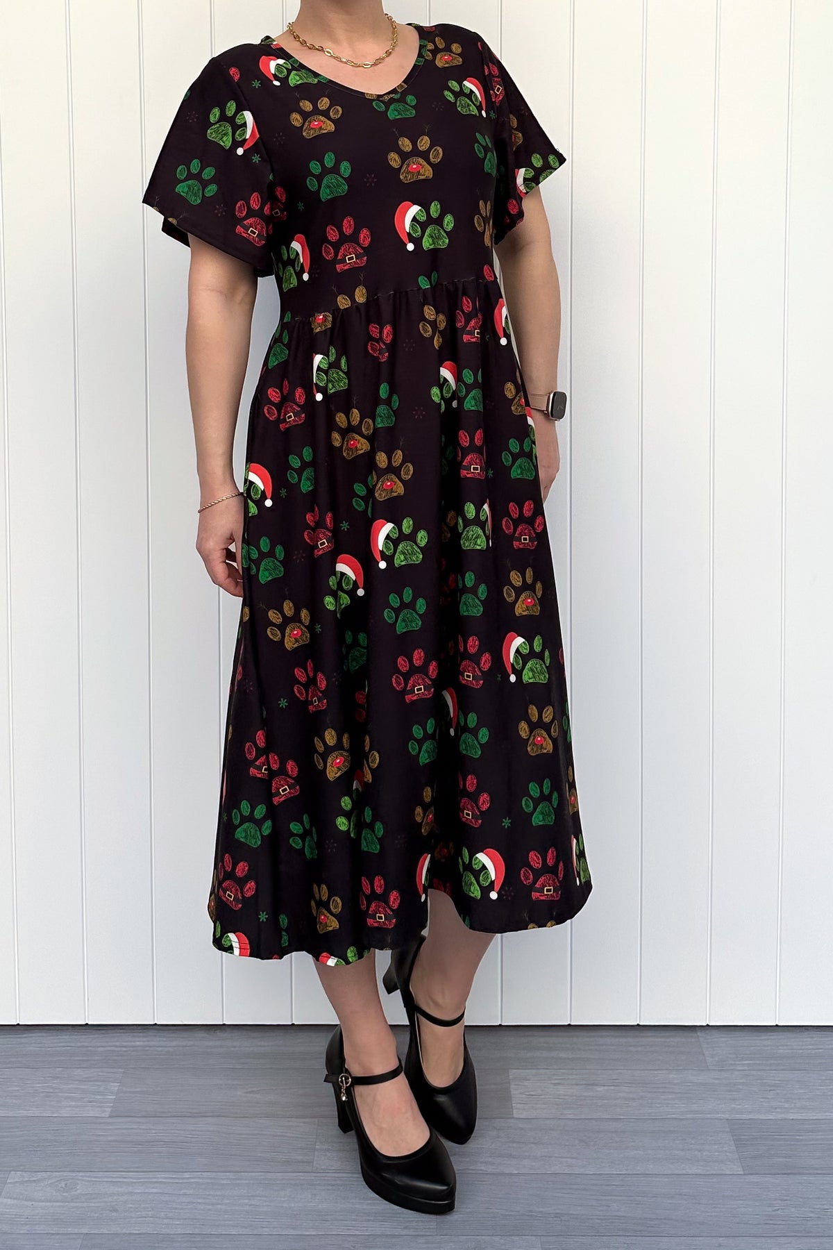 The Santa Paws Midi Dress is a joyful blend of festive fun and comfort, featuring red, gold, and green paw prints disguised as Santa and reindeer against a black backdrop. It’s a print that makes every moment, from tree decorating to holiday feasts, feel warm and wonderfully playful.