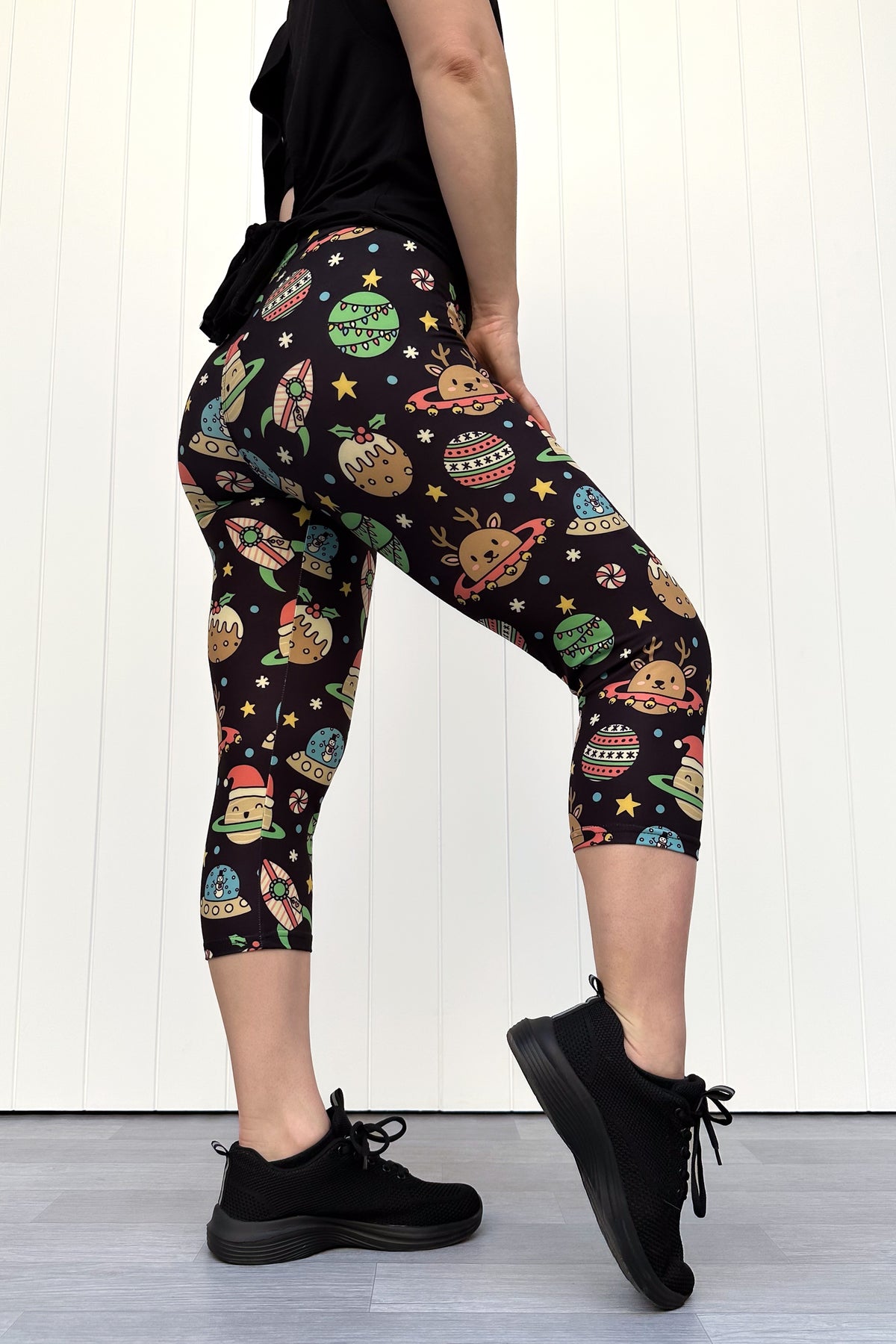 The Space Christmas Capri Leggings  will take you on an adventure across galaxies filled with rockets, reindeer, puddings and baubles. Playful, bold and comfortable, they’re ready for any festive moment, from holiday shopping to Christmas morning fun.