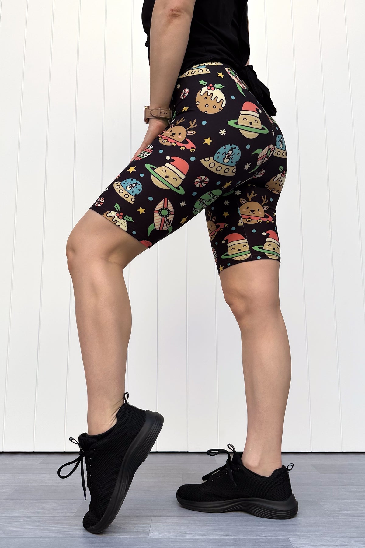 Person wearing black shorts with colorful space-themed Christmas pattern standing against a white wall.