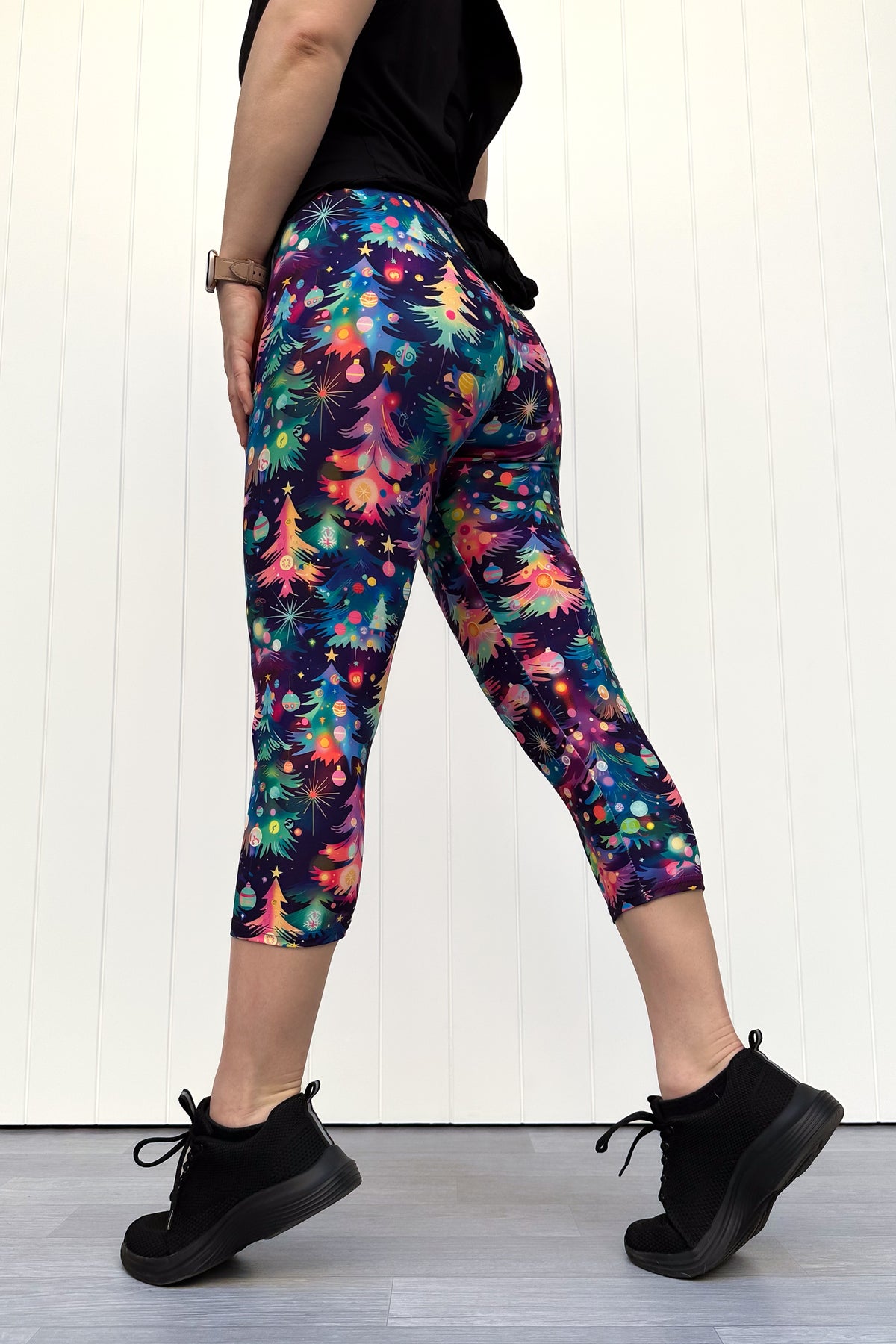 The Vivid Christmas Capri Leggings bring all the sparkle to your holiday festivities. Covered in bright rainbow trees, glowing baubles and a flurry of holiday joy, they’re made for anyone who takes their Christmas spirit seriously (but not themselves).