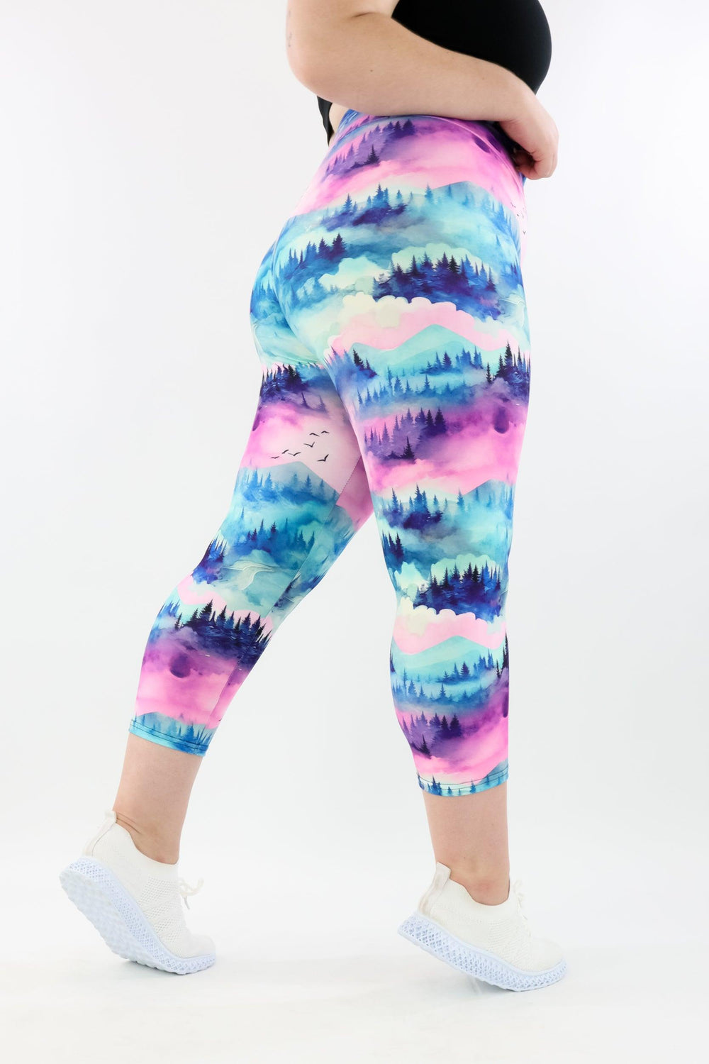 Wilderness Casual Capri Leggings features a printed foggy mountains and forrest scenery in twilight pinks and blues. Made from our signature buttery soft fabric, it'll feel like wearing nothing.